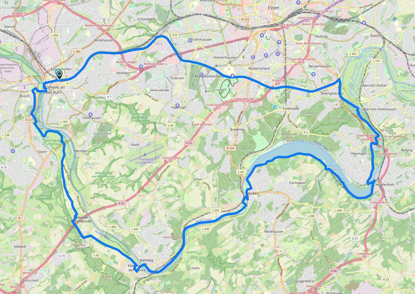Mülheim Hbf. - RS1 - Grugatrasse - Essen - Ruhr - Ruhrtal-Radweg - Baldeneysee - Werden - Kettwig - Mülheim Hbf.