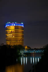 Mit einer Höhe von 117,5 m, einem Durchmesser von 67 m und einem Speichervolumen von 347.000 m3 war der zwischen 1927 und 1929 erbaute "Scheiben-Gasbehälter" der größte Europas. Er diente zunächst als Zwischenspeicher für "Gichtgas", einem Abfallprodukt der Hochöfen der Gutehoffnungshütte. Im Zweiten Weltkrieg wurde der Gasometer schwer beschädigt. Nach einem Brand im Jahre 1946 musste er bis auf das Fundament abgetragen werden. Danach wurde er in alter Form wieder aufgebaut und war von 1949 bis 1988 in Betrieb. Nach der Schließung des Hochofenwerkes 1978 wurde der Gasometer für die Lagerung des Koksofengases der Kokerei der benachbarten Zeche Osterfeld benutzt.
